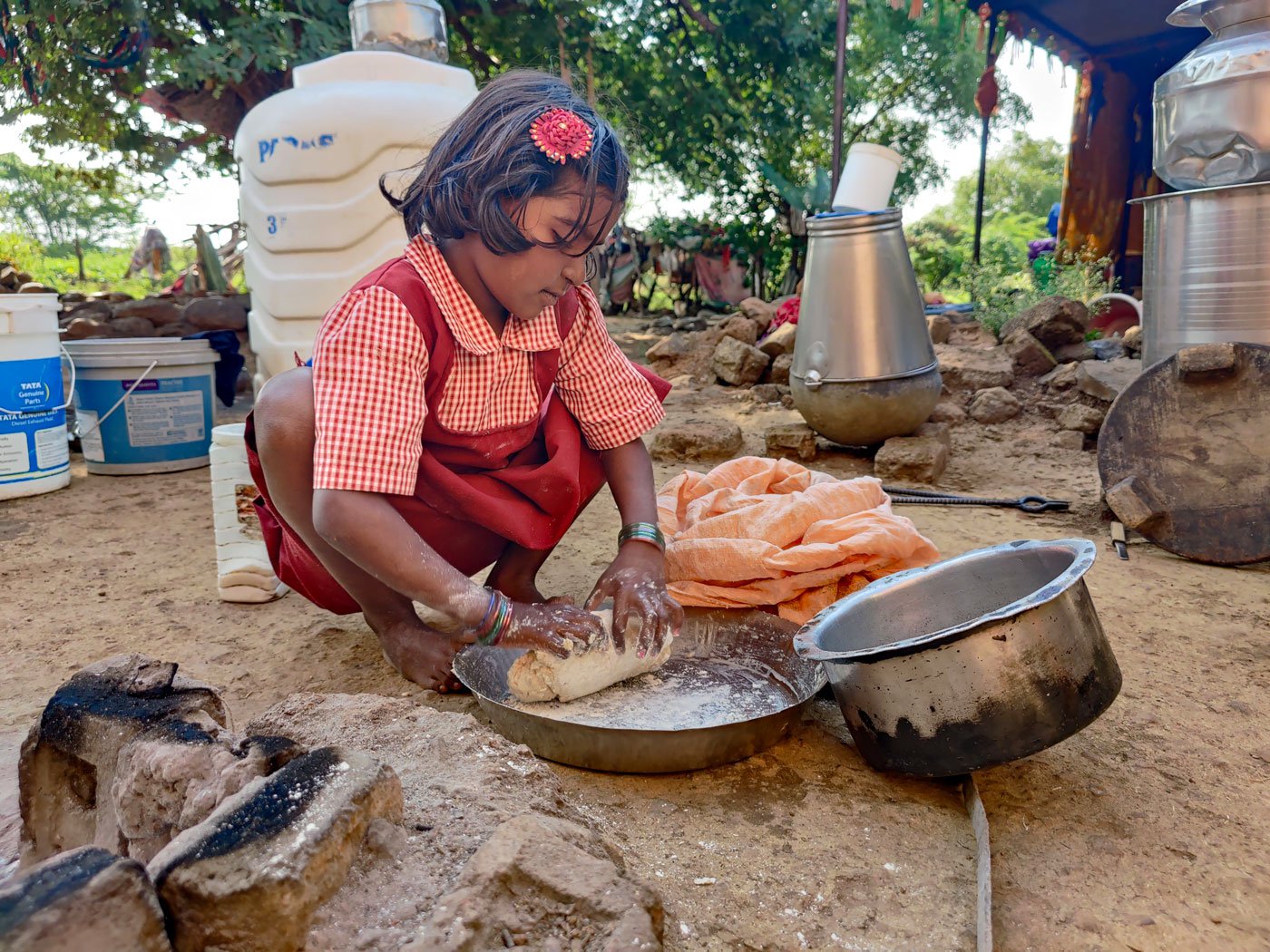 “பெரும்பாலும் என் சகோதரியுடன்தான் இருக்கிறேன்,” என்கிறார் இளம் அஷ்வினி. “பாட்டி எங்களை பார்த்துக் கொள்ள சில வாரங்களுக்கு வருவார். நான் உணவு சமைப்பேன். பள்ளியை பற்றி எனக்கு தெரியாது. அதைப் பற்றி யோசித்ததில்லை. சீருடைகளில் பெண் குழந்தைகளை பார்த்திருக்கிறேன். அவர்கள் நன்றாக இருப்பார்கள்,” என்கிறார் அவர்.