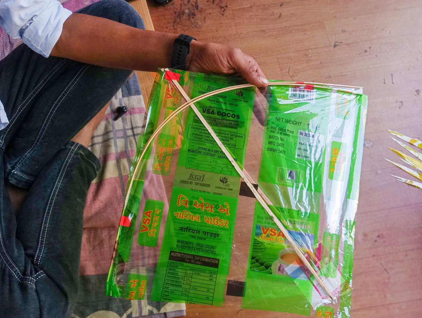 “एक तिलंगी सात हिस्सों में बनती है और प्रत्येक हिस्से के लिए अलग कारीगर होता है,” आयशा बताती हैं. एक कारीगर ज़रूरत के हिसाब से अलग-अलग वर्गाकारों में प्लास्टिक की शीट काटता है. दो लोग बांस को काटकर तीलियां और खड्डे बनाते हैं – पहली, पतली और लंबी होती है और दूसरी अपेक्षाकृत थोड़ी मोटी और छोटी होती हैं. खड्डे को प्लास्टिक के वर्गाकारों पर चिपकाने के लिए अलग कारीगर होता है. आख़िर में पतंग को उस कारीगर के पास बढ़ा दिया जाता है जो उनपर मुड़ी हुई तीलियां चिपकाने का काम करता है.